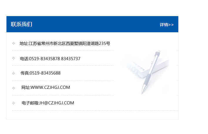 傳真:0519-83435688    郵編:213135    網址:WWW.czjhgj_com.lbzkjs.com    電子郵箱:JH@czjhgj_com.lbzkjs.com